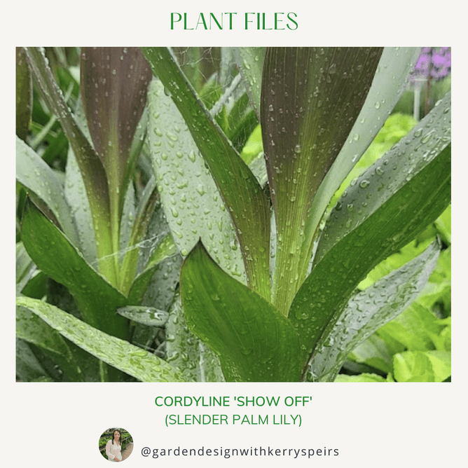 The long green leaves have purple-tinged tips and overall the plant has a very bold and sculptural form yet is soft to the touch. Cordyline 'Show Off' (or is it 'Showoff' I'm never quite sure π ) is one of those versatile plants with an aesthetic that works well in most garden planting themes, especially subtropical and contemporary themed gardens.